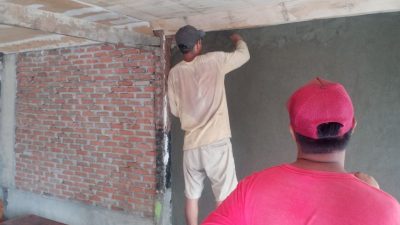 MAJENE, Kardi, tampak asyik memasang plester di sebuah rumah di lingkungan Garogo, Kelurahan Baru Kabupaten…